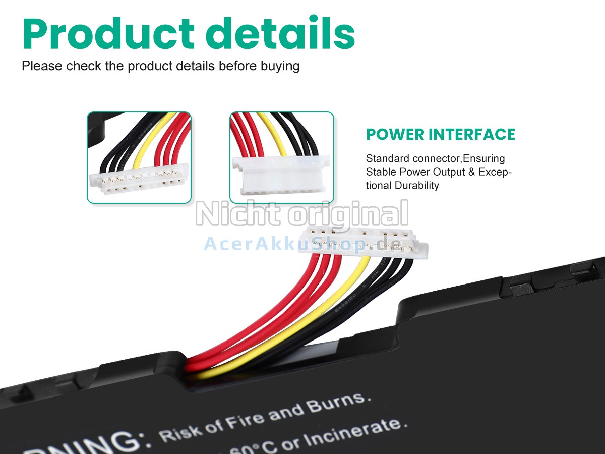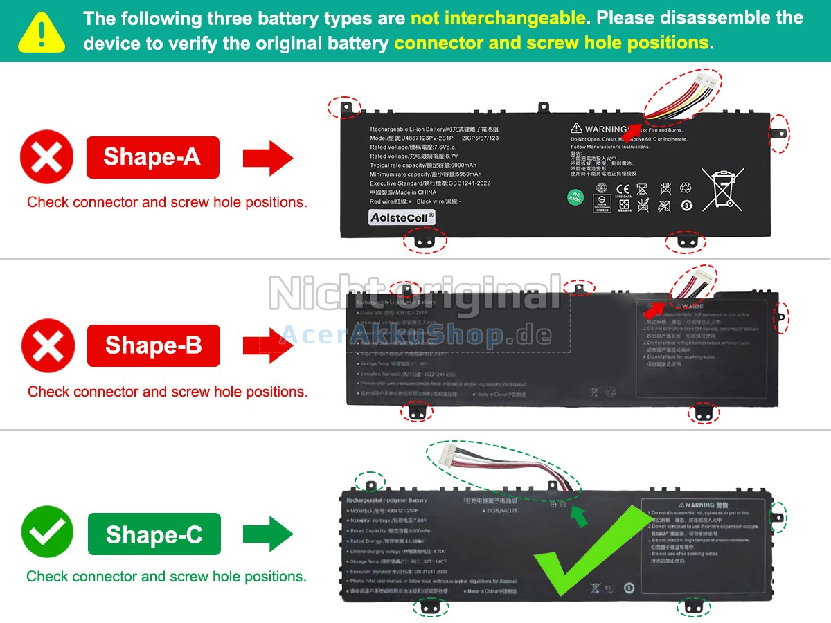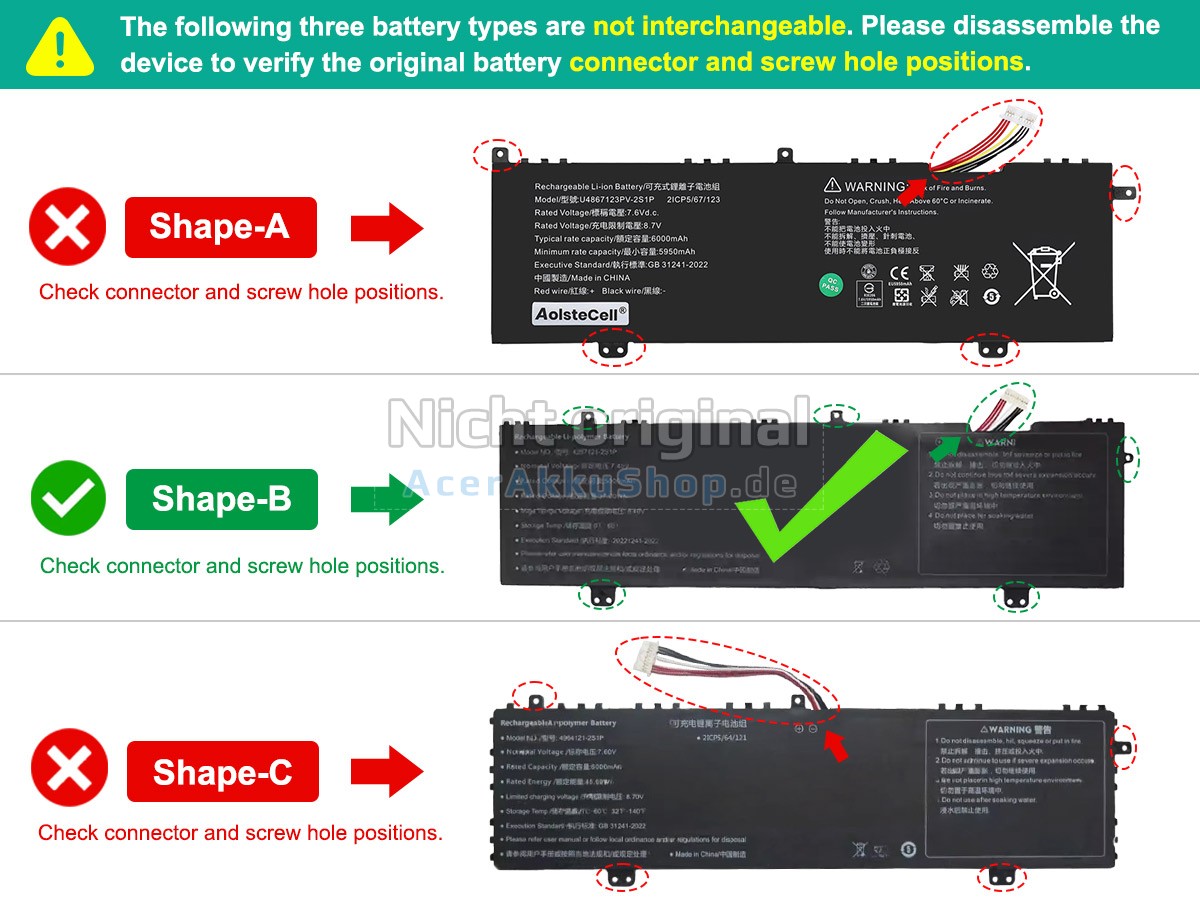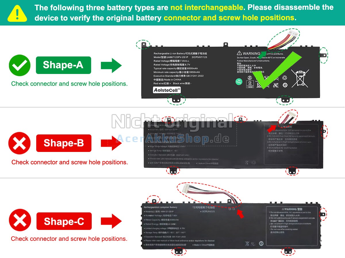 2Bei einigen eingebauten Akkus gibt es wegen der unterschiedlichen inneren Struktur zwei Versionen, also Typ A und Typ B. Unter diesem Umstand müssen Sie Ihren Laptop demontieren, um Ihre originale Batterie zu überprüfen, um Ihre Originalakku mit der auf unserer Webseite angezeigten Ersatzakku zu vergleichen. Wenn Sie Ihren Acer-Laptop nicht demontieren können, können Sie uns auch die Modellnummer Ihres Laptops mitteilen.